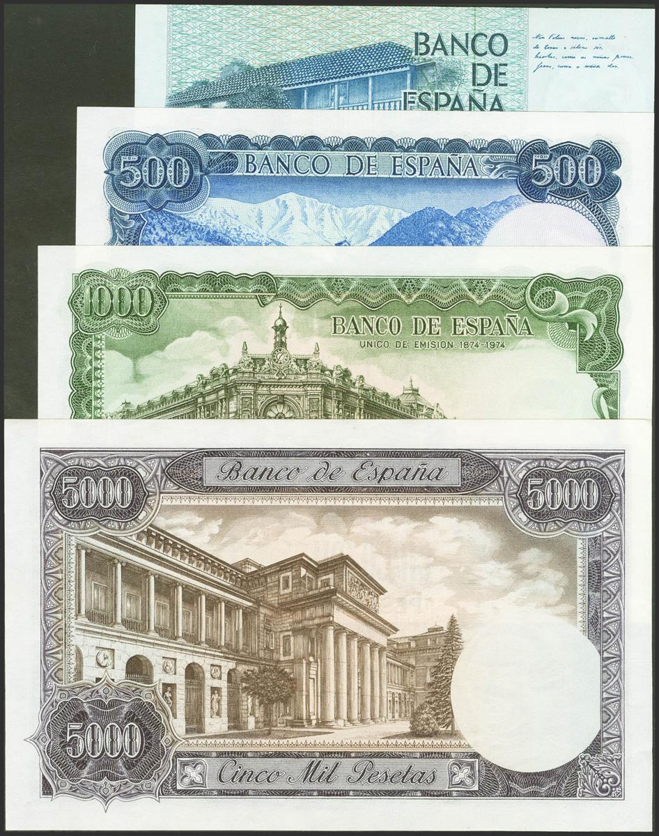 English Set of four banknotes of 500 Pesetas (2), 1000 Pesetas and 5000 Pesetas issued on July 23, 1971, September 17, 1971, February 6, 1976 and October 23, 1979, with series A, G, I and 5P, respectively (Edifil 2021: 473a, 474c, 475a, 476a). Almost Uncirculated.