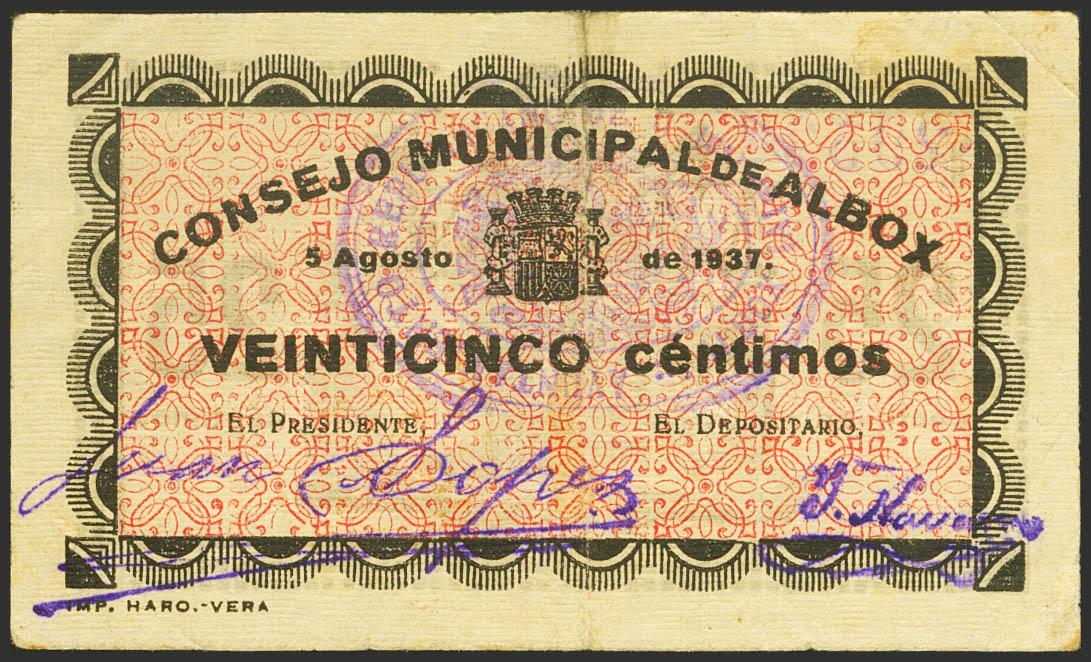 English ALBOX (ALMERIA). 25 Cents. August 5, 1937. (González: 238). Almost Extremely Fine.