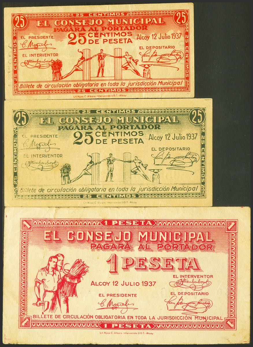 English ALCOY (ALICANTE). 25 Cents (both types) and 1 Peseta. June 12, 1937. Series A, the first and B the last two. (González: 377, 378, 380). Extremely Fine/ Good Very Fine.