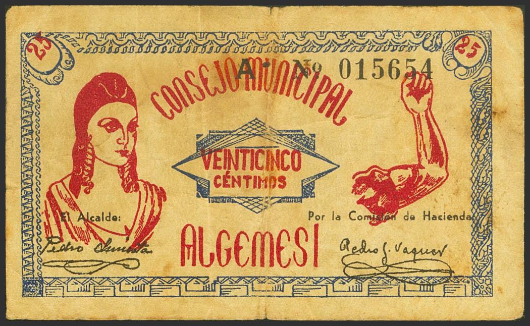 English MUNICIPAL COUNCIL OF ALGEMESI (VALENCIA). 25 Cents. (1937ca). Series A. (González: 475). Almost Very Fine.