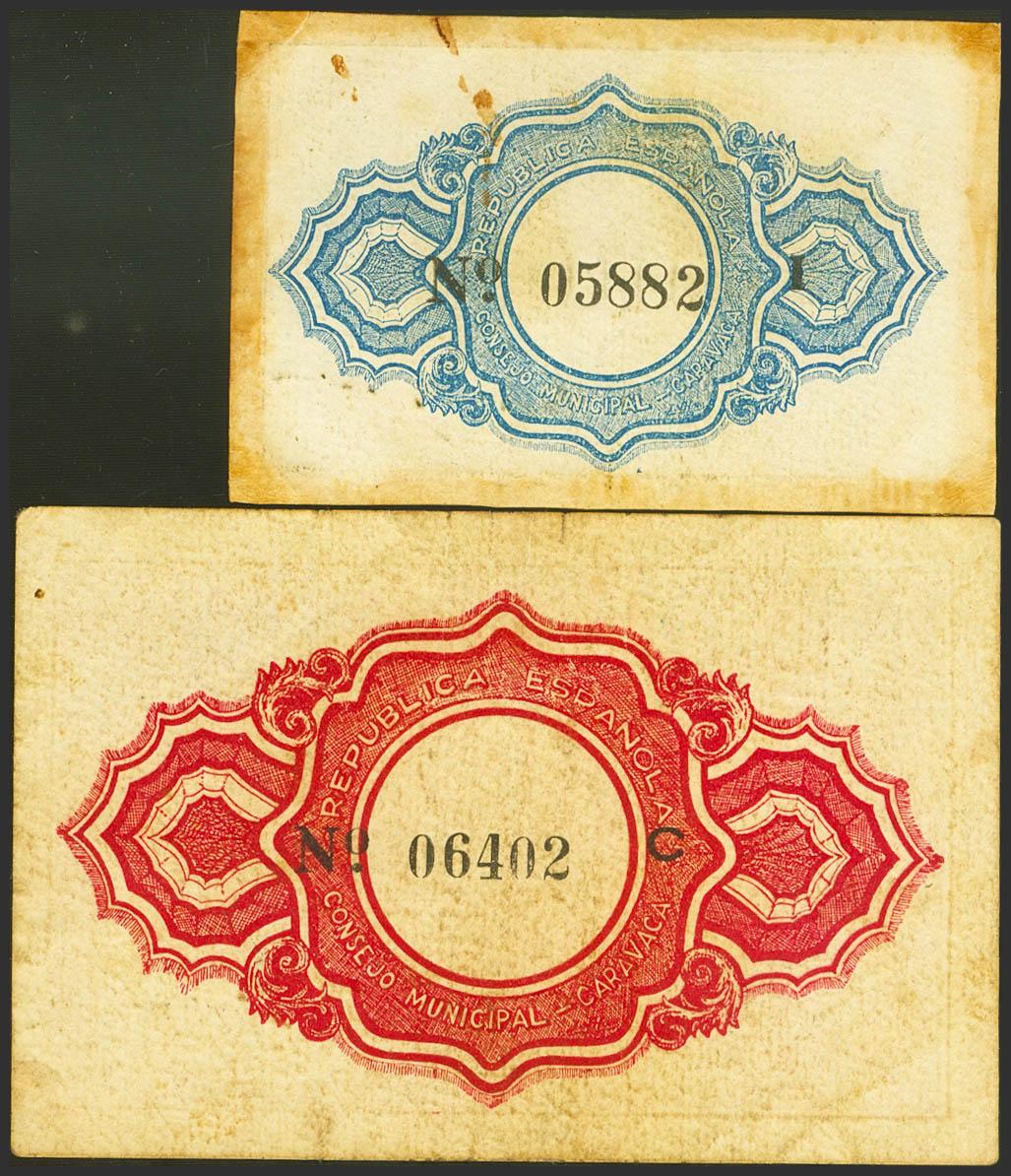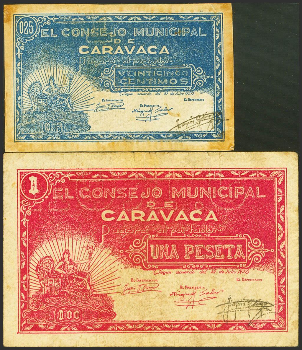 CARAVACA (MURCIA). 25 Cents and 1 Peseta. (1937ca). Series I and C, respectively. (González: 1609, 1611). Good Very Fine.