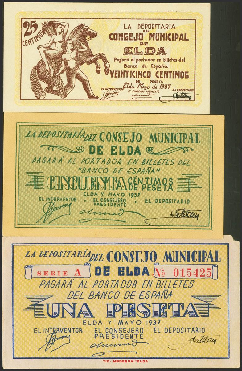ELDA (ALICANTE). 25 Cents and 1 Peseta. May 1937. Series A. (González: 2291/93). Rare complete series, especially in this exceptional quality. Uncirculated/ Almost Uncirculated-.