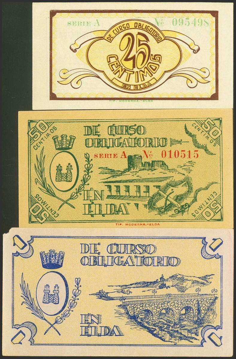 ELDA (ALICANTE). 25 Cents and 1 Peseta. May 1937. Series A. (González: 2291/93). Rare complete series, especially in this exceptional quality. Uncirculated/ Almost Uncirculated-.