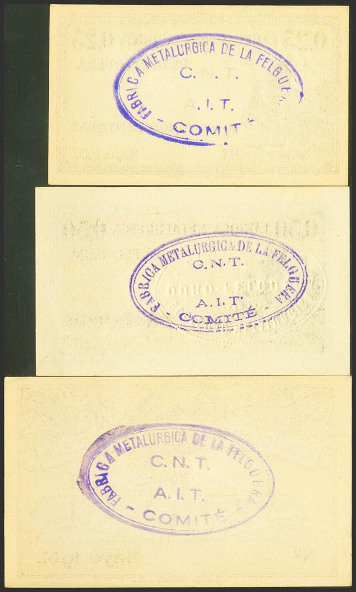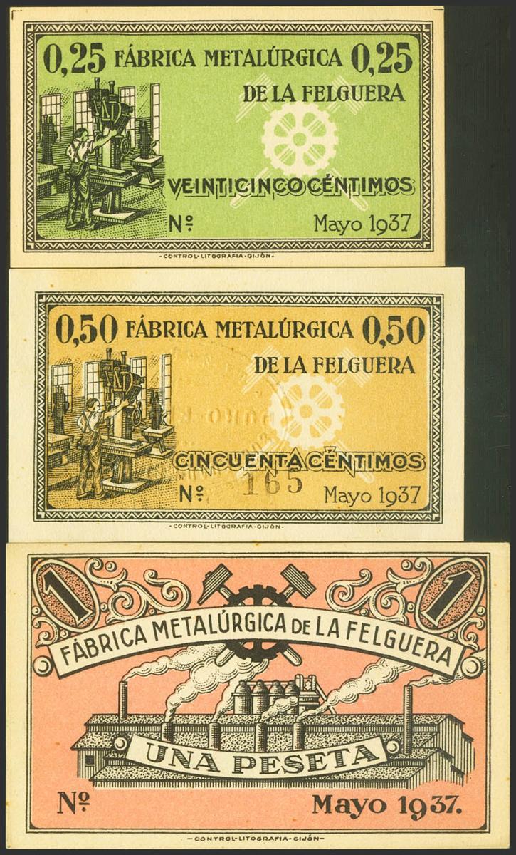 FELGUERA (ASTURIAS). 25 Cents, 50 Cents and 1 Peseta. May 1937. (González: 2431, 2432, 2433). Rare, especially in this exceptional quality. Uncirculated/ Almost Uncirculated.