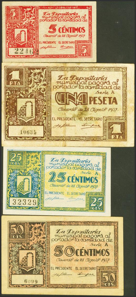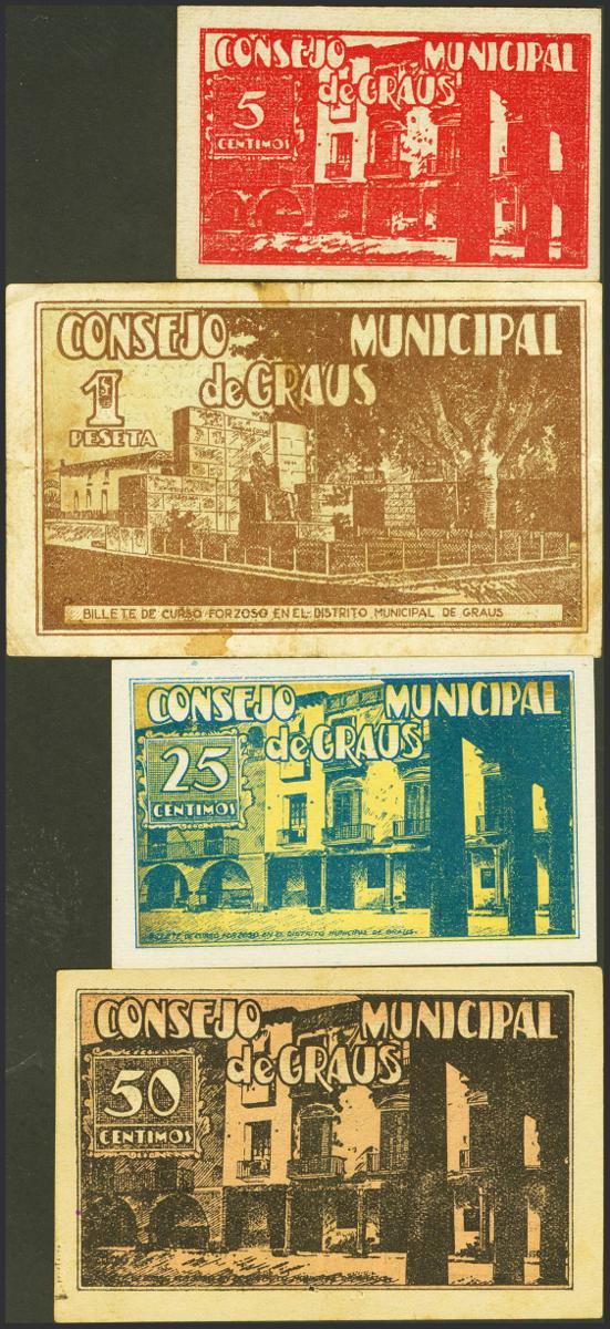 English GRAUS (HUESCA). 5 Cents, 25 Cents, 50 Cents and 1 Peseta. August 28, 1937. Series A, all values ​​except 5 cts which has no series. (González: 2726/29). Rare complete series. Almost Extremely Fine/ Uncirculated.