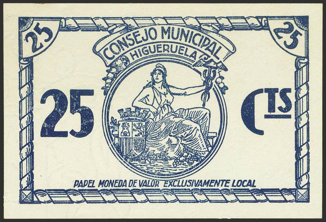 HIGUERUELA (ALBACETE). 25 Cents. (1937ca). (González: 2842). Unusual, especially in this exceptional quality. Almost Uncirculated.