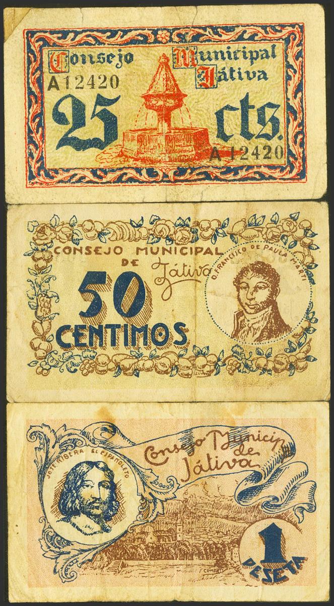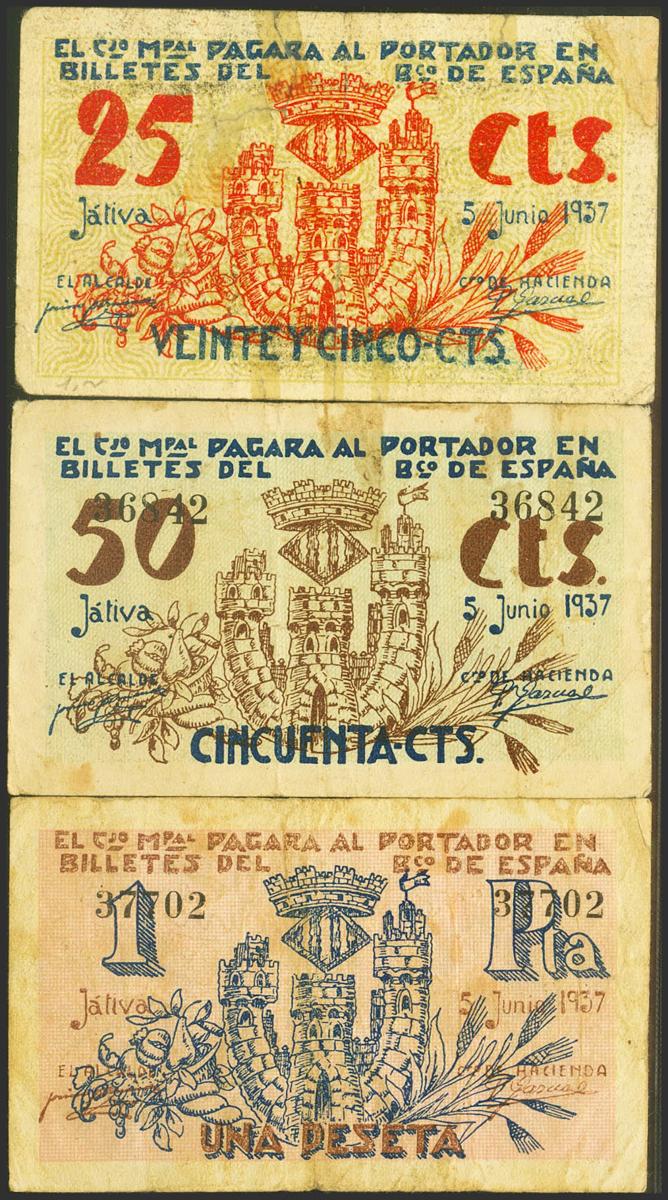 JATIVA (VALENCIA). 25 Cents, 50 Cents and 1 Peseta. June 5, 1937. The 25 cts series A. (González: 3024, 3025, 3026). Very Fine.