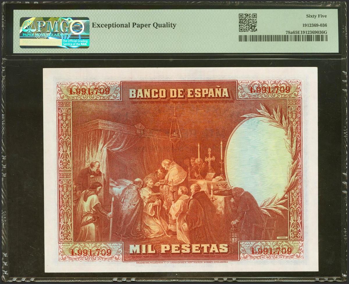 1000 Pesetas. August 15, 1928. No series. (Edifil 2021: 357, Pick: 78a). Unusual, original sizing. Uncirculated. PMG65EPQ package.