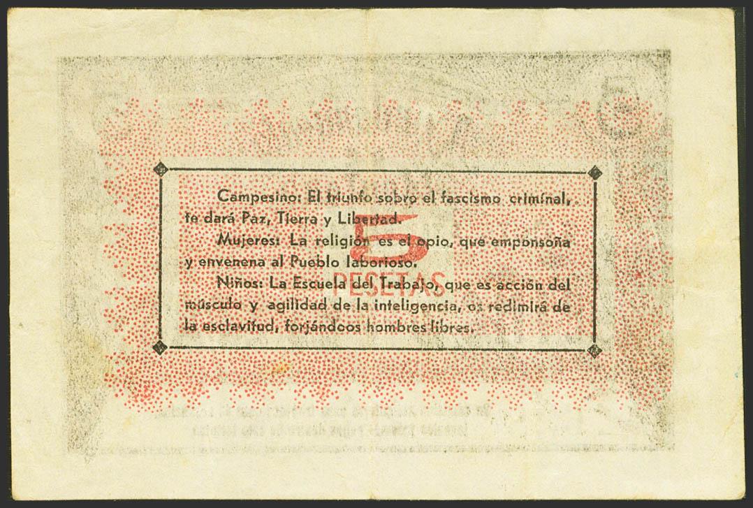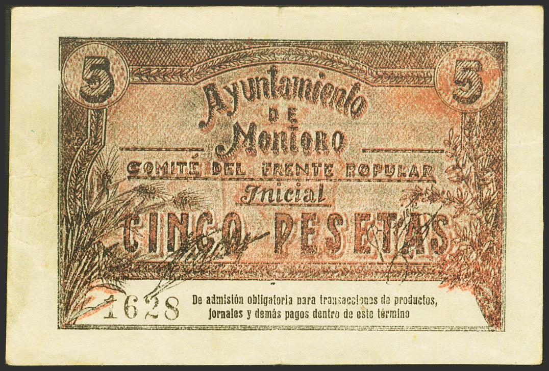 MONTORO (CORDOBA). 5 Pesetas. (1937ca). (González: 3668). Rare. Good Very Fine.