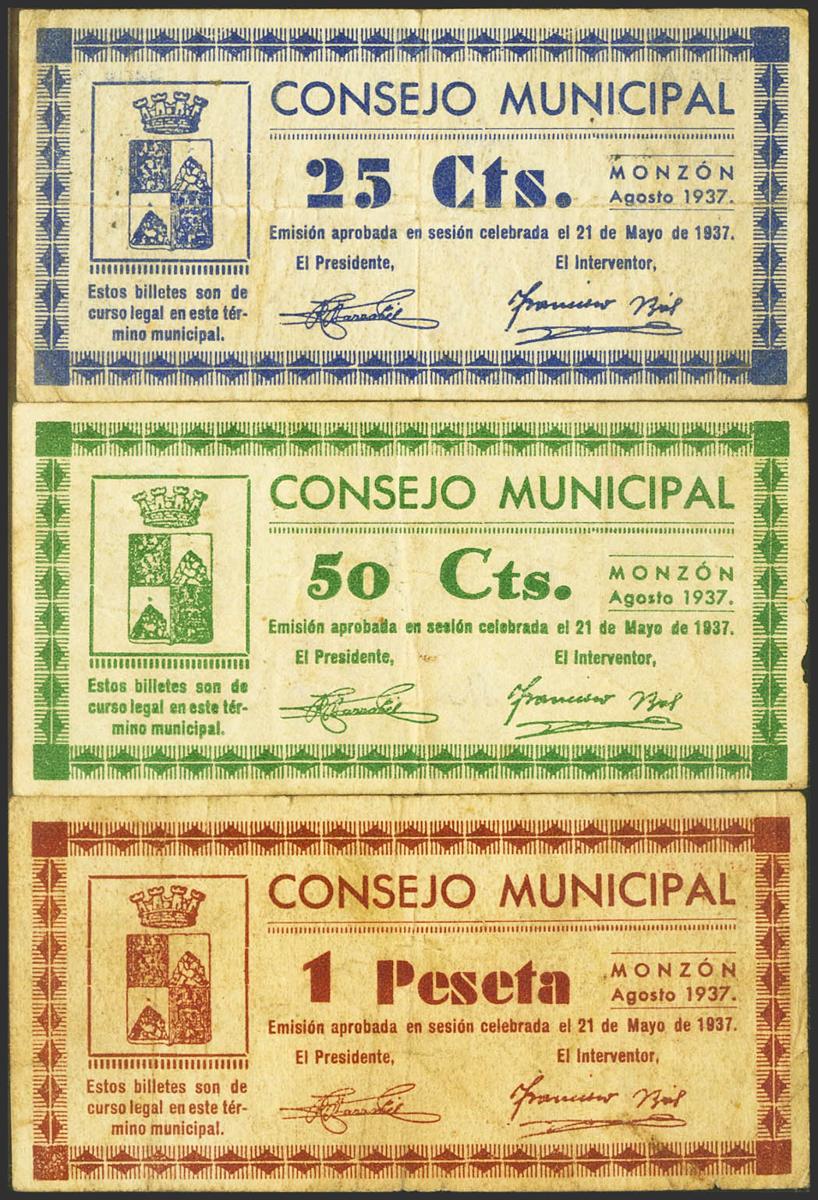 English MONZON (HUESCA). 25 Cents, 50 Cents and 1 Peseta. August 1937. (González: 3680/82). Complete series. Almost Very Fine.