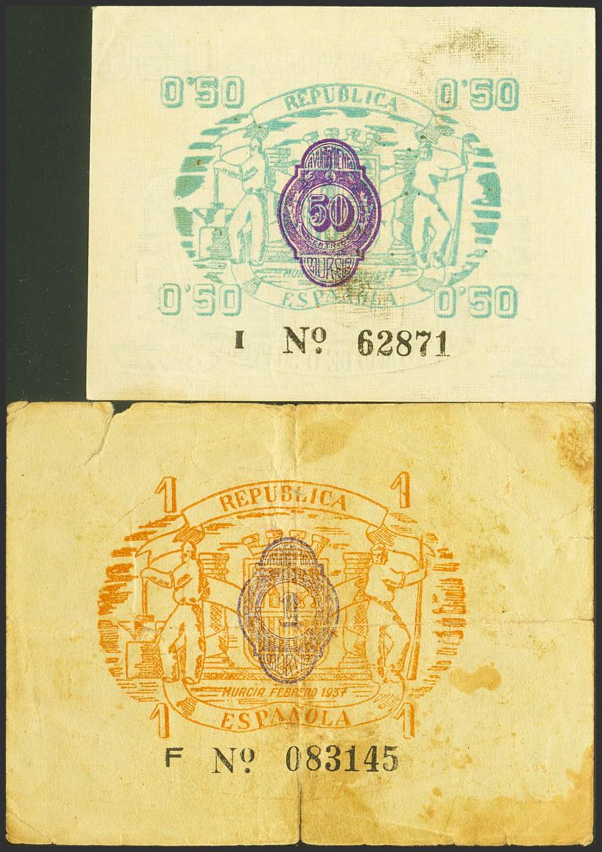 MURCIA. 50 Cents and 1 Peseta. (1937ca). Series I and F, respectively. (González: 3769/70). Rare complete series. Almost Uncirculated/ Almost Fine.
