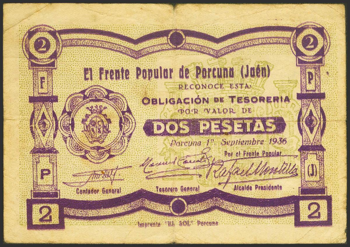 English PORCUNA (JAEN). 2 Pesetas. September 1, 1937. (González: 4244). Unusual. Almost Very Fine.