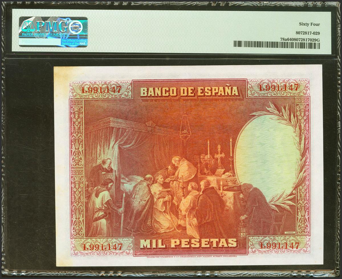 1000 Pesetas. August 15, 1928. No series. (Edifil 2021: 357, Pick: 78a). Unusual. Uncirculated. PMG64 encapsulation.