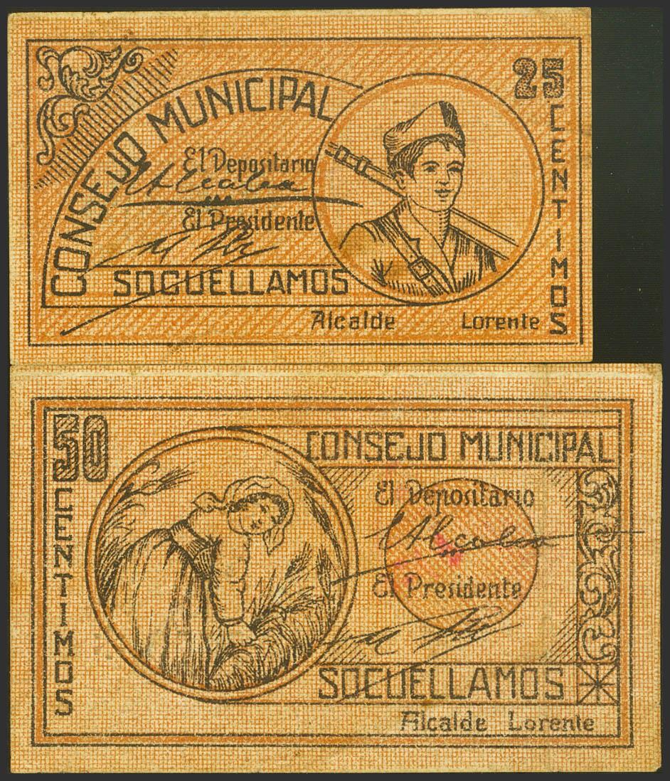 English SOCUELLAMOS (CIUDAD REAL). 25 Cents and 50 Cents. 1937. Series A, both. (González: 4882, 4883). Unusual. Almost Extremely Fine/ Good Very Fine.