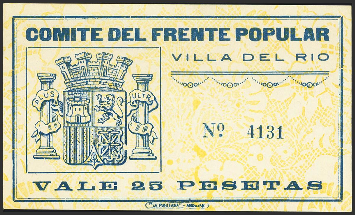 English VILLA DEL RIO (CORDOBA). 25 Pesetas. (1937ca). (González: 5493). Very rare. Almost Uncirculated.