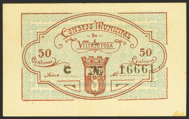 VILLAJOYOSA (ALICANTE). 50 Cents. May 24, 1937. Series C. (González: 5550). Rare, especially in this exceptional quality. Almost Uncirculated.