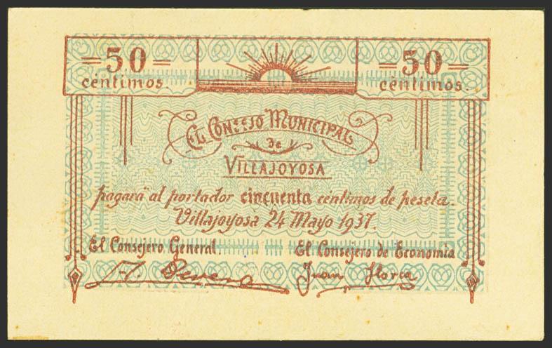 VILLAJOYOSA (ALICANTE). 50 Cents. May 24, 1937. Series C. (González: 5550). Rare, especially in this exceptional quality. Almost Uncirculated.