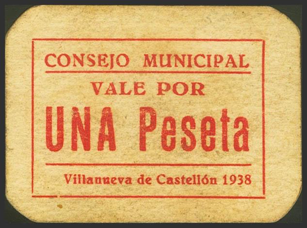 English VILLANUEVA DE CASTELLON (VALENCIA). 1 Peseta. 1938. Series A. (González: 5619). Rare. Extremely Fine.