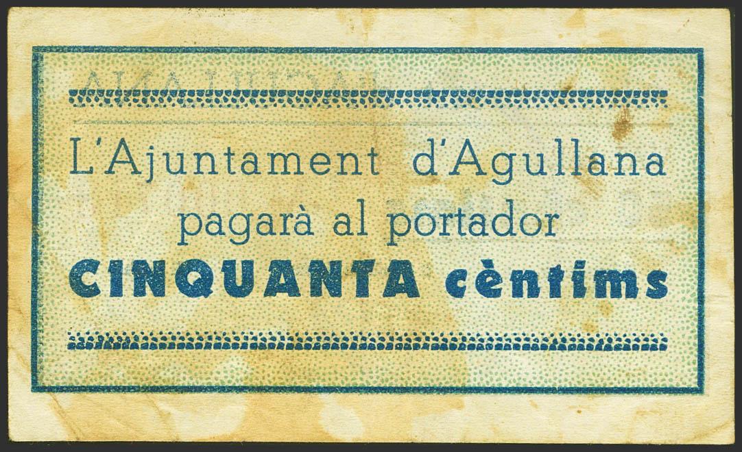 English AGULLANA (GERONA). 50 Cents. (1937ca). (González: 6033). Very rare. Good Very Fine.