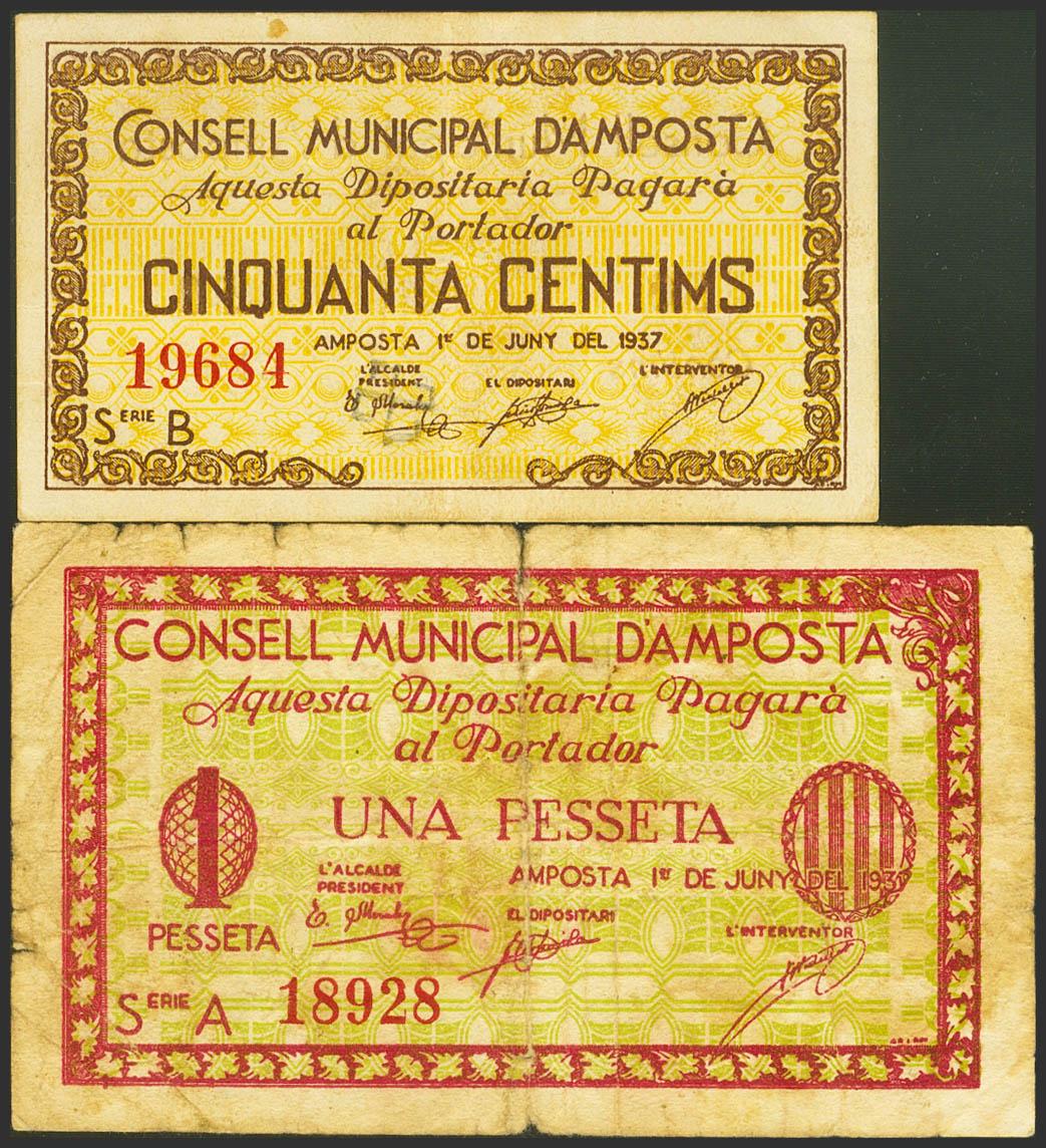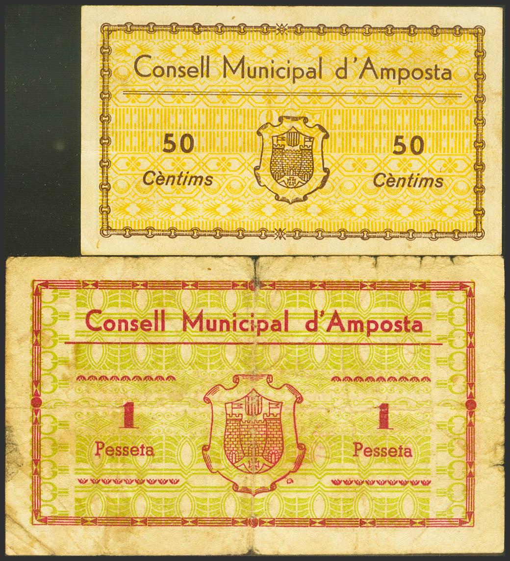 AMPOSTA (TARRAGONA). 50 Cents and 1 Peseta. June 1, 1937. Series B and A, respectively. (González: 6275/76). Extremely Fine/ Almost Very Fine.