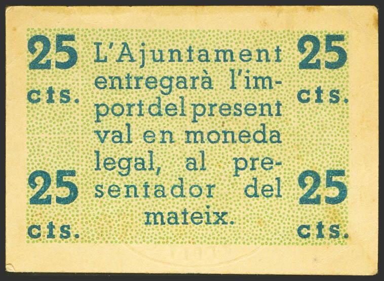 ARBUCIES (GERONA). 25 Cents. June 26, 1937. Series C. (González: 6324). Unusual. Extremely Fine.
