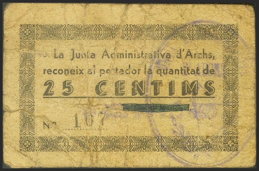 ARCHS (LERIDA). 25 Cents. (1937ca). (González: 6329). Very rare. Almost Fine.
