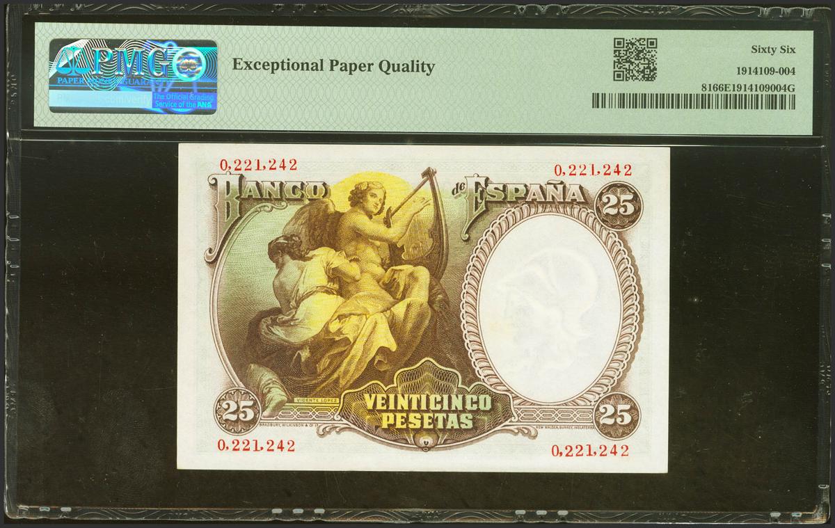 25 Pesetas. April 25, 1931. No series. (Edifil 2021: 358, Pick: 81). Rare in this exceptional quality, original sizing. Uncirculated. PMG66EPQ package.