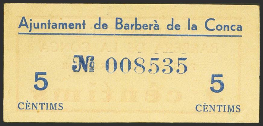 BARBERA DE LA CONCA (TARRAGONA). 5 Cents. (1937ca). (González: 6517). Unusual in this exceptional quality. EBC+++.