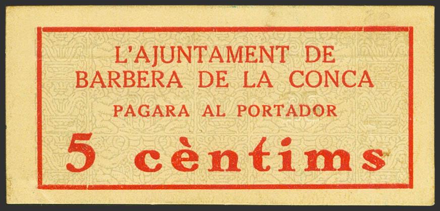 BARBERA DE LA CONCA (TARRAGONA). 5 Cents. (1937ca). (González: 6517). Unusual in this exceptional quality. EBC+++.