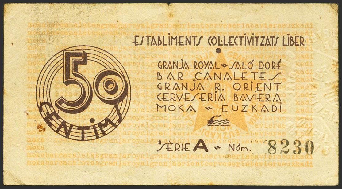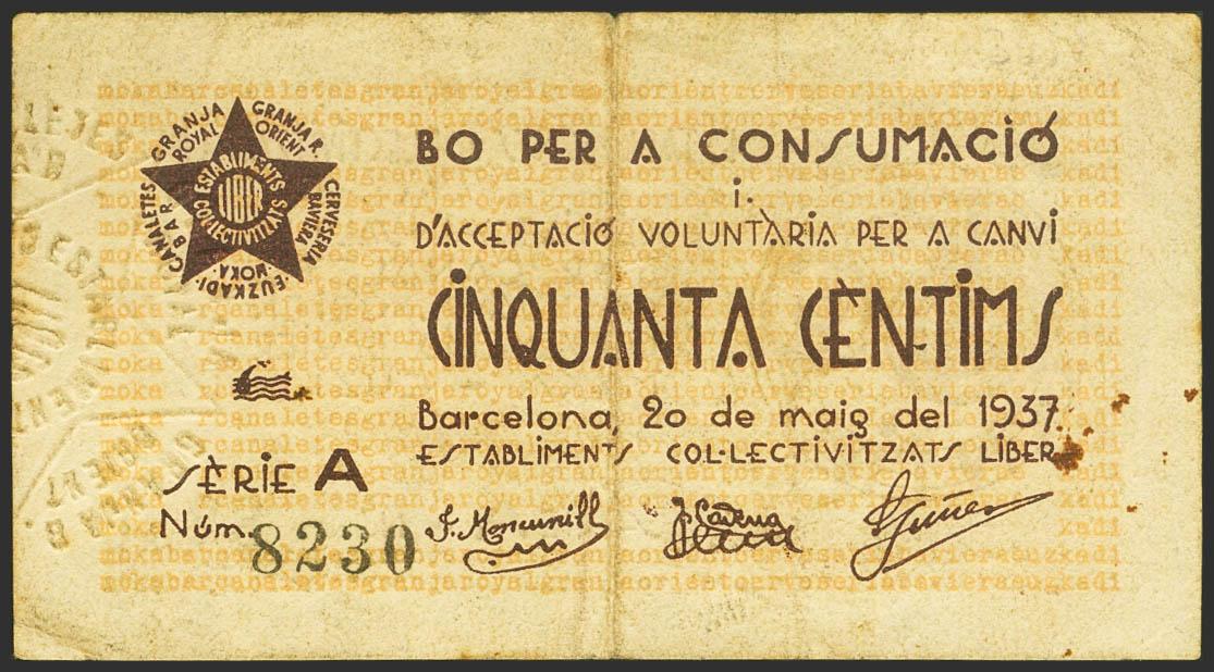 BARCELONA (ESTABLIMENTS COLLECTIVITZATS LIBER). 50 Cents. May 20, 1937. Series A. (González: 6714). Very Fine.