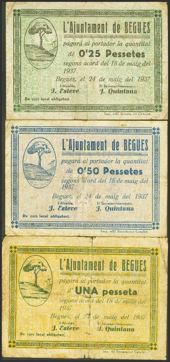 English BEGUES (BARCELONA). 25 Cents (second issue), 50 Cents (second issue) and 1 Peseta (first issue). May 24, 1937. Series A (25 cts and 50 cts). (González: 6937, 6938, 6939). Very Fine/ Fine (broadcasts are distinguished by series).