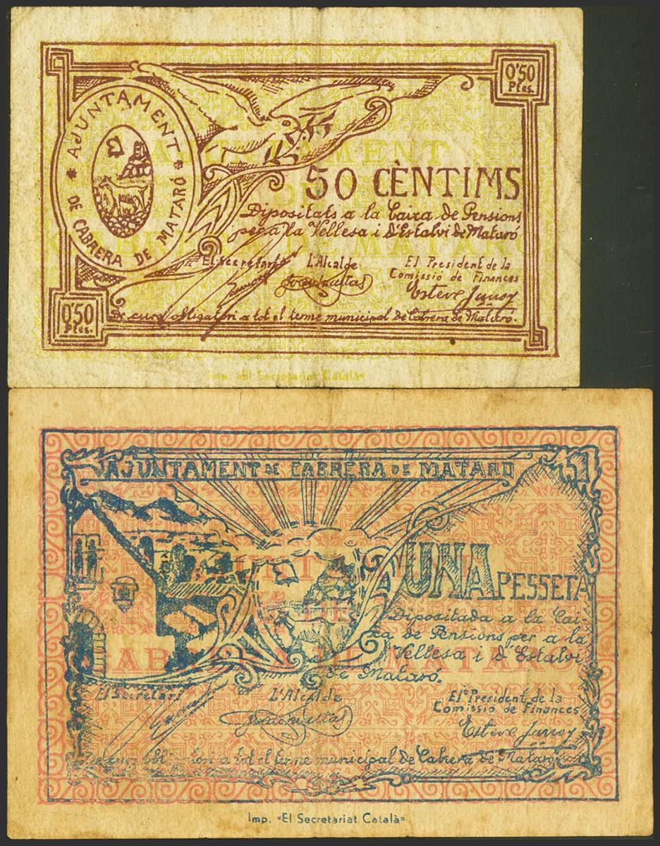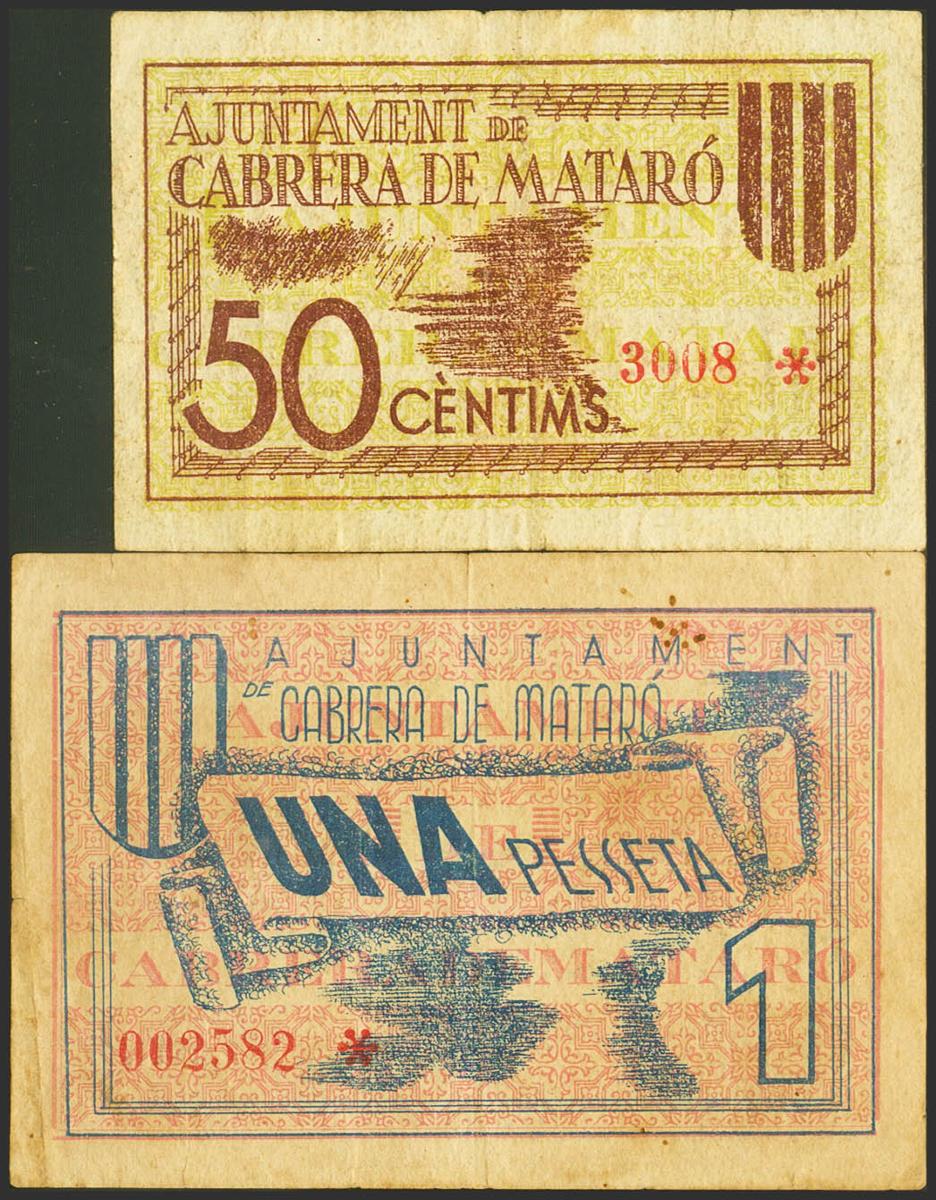 English CABRERA DE MATARO (BARCELONA). 50 Cents and 1 Peseta. (1938ca). (González: 7238/39). Complete series. Almost Very Fine.