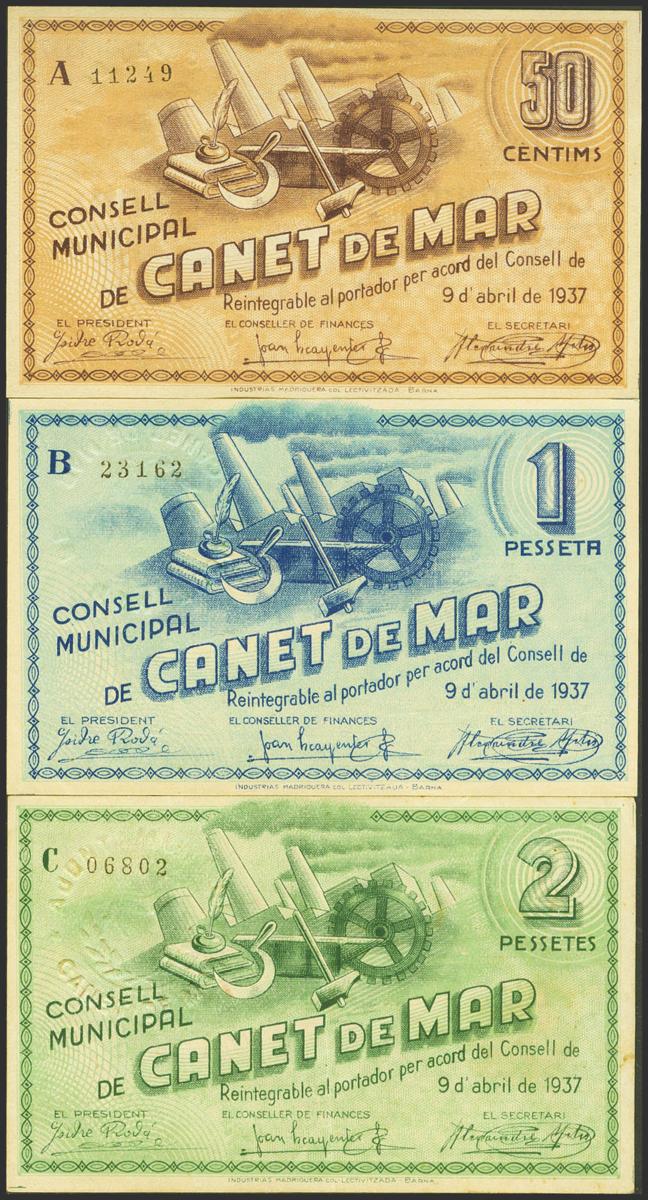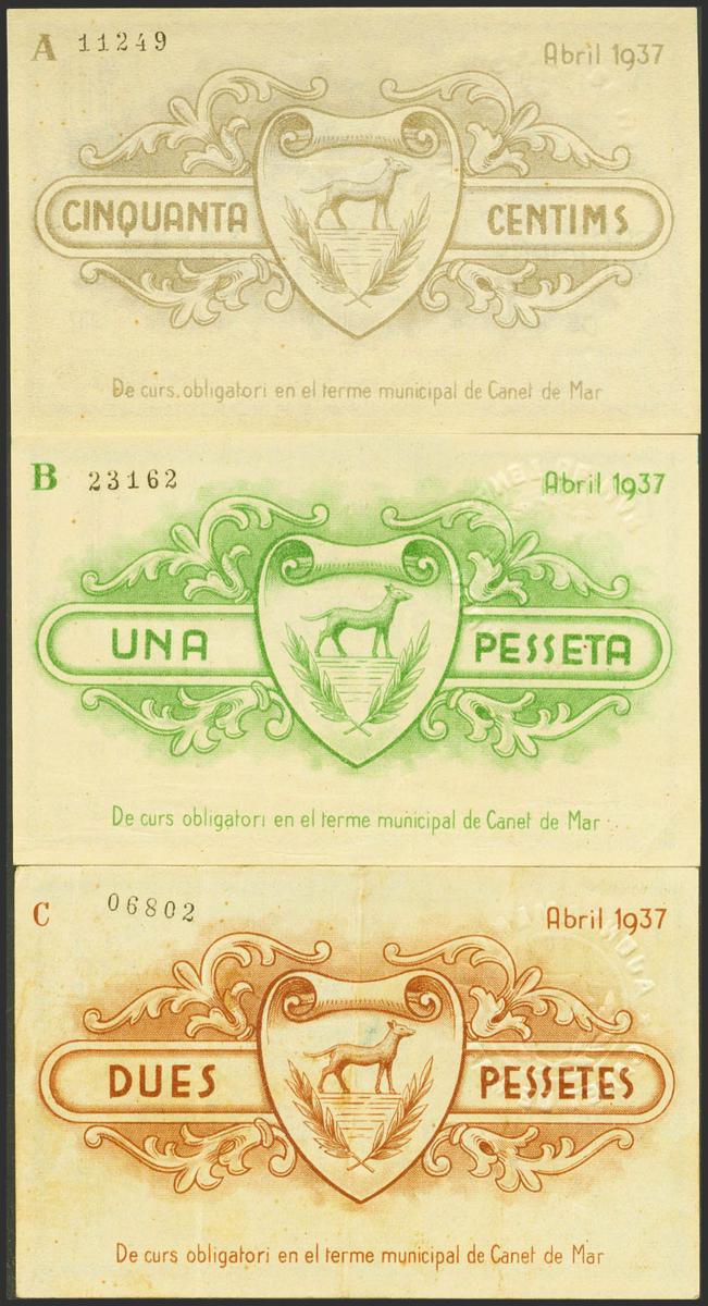 English CANET DE MAR (BARCELONA). 50 Cents. April 9, 1937. Series A, B and C, respectively. (González: 7342/44). Good Very Fine/ Almost Uncirculated.