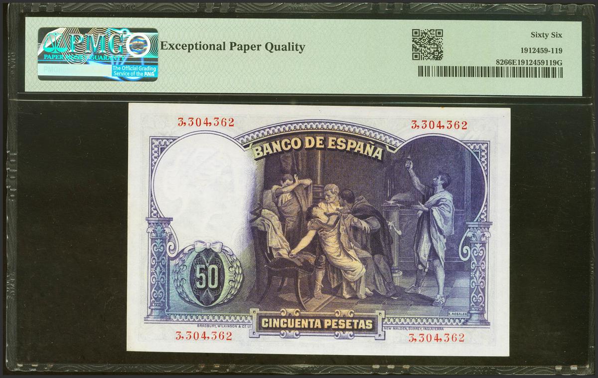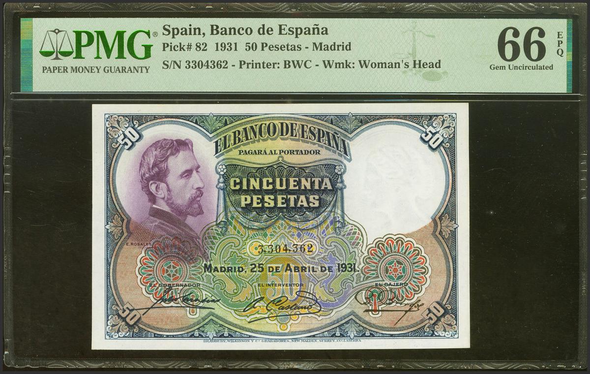 50 Pesetas. April 25, 1931. No series. (Edifil 2021: 359, Pick: 82). Rare in this exceptional quality, original sizing. Uncirculated. PMG66EPQ package.
