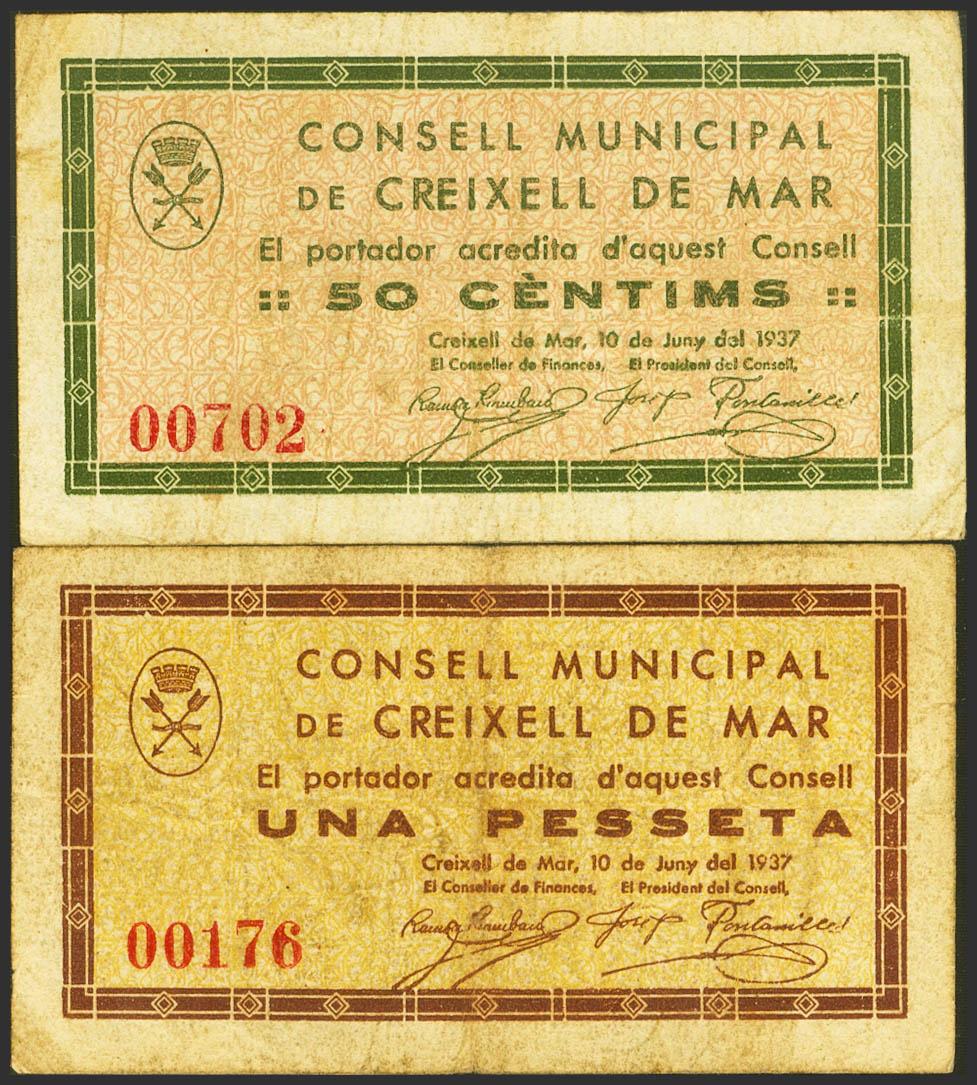 English CREIXELL DE MAR (TARRAGONA). 50 Cents and 1 Peseta. June 10, 1937. (González: 7701, 7702). Rare. Very Fine.