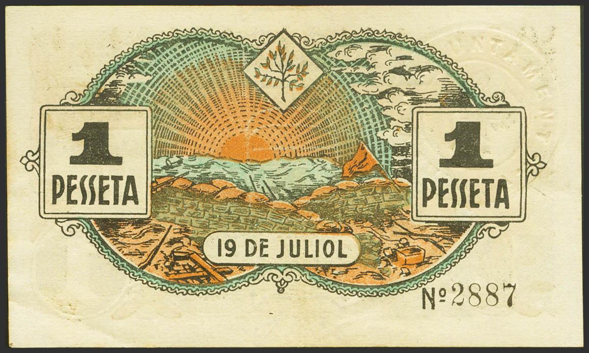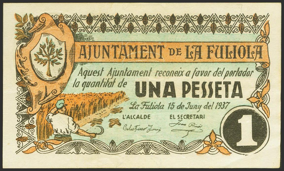 THE FULIOLA (LERIDA). 1 Peseta. June 15, 1937. (González: 7943). Rare, especially in this exceptional quality. Good Extremely Fine