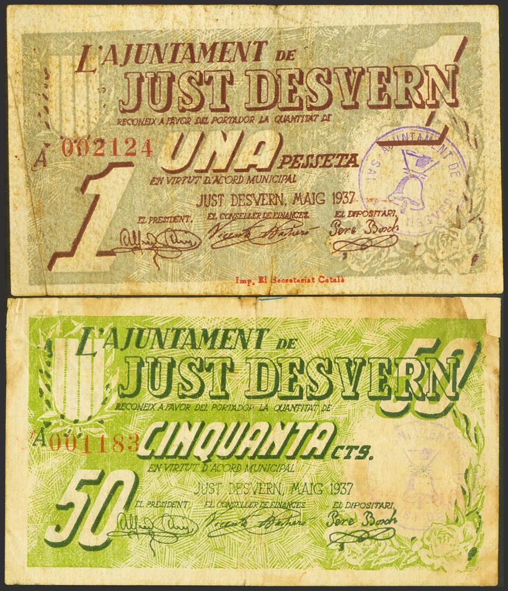 JUST DESVERN (BARCELONA). 50 Cents and 1 Peseta. May 1937. Series A, both. (González: 8300/01). Complete series. Almost Very Fine.