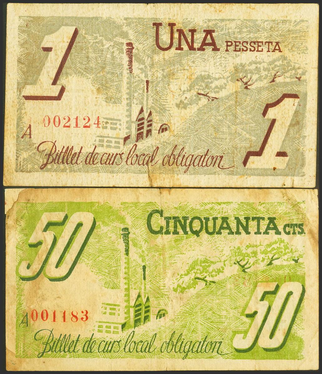 JUST DESVERN (BARCELONA). 50 Cents and 1 Peseta. May 1937. Series A, both. (González: 8300/01). Complete series. Almost Very Fine.