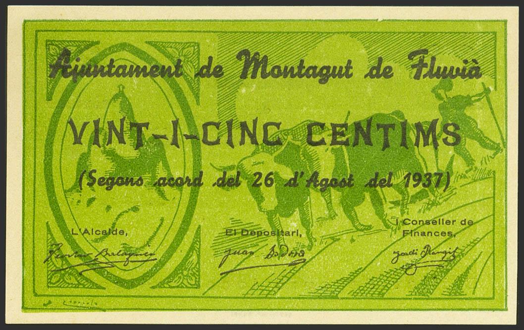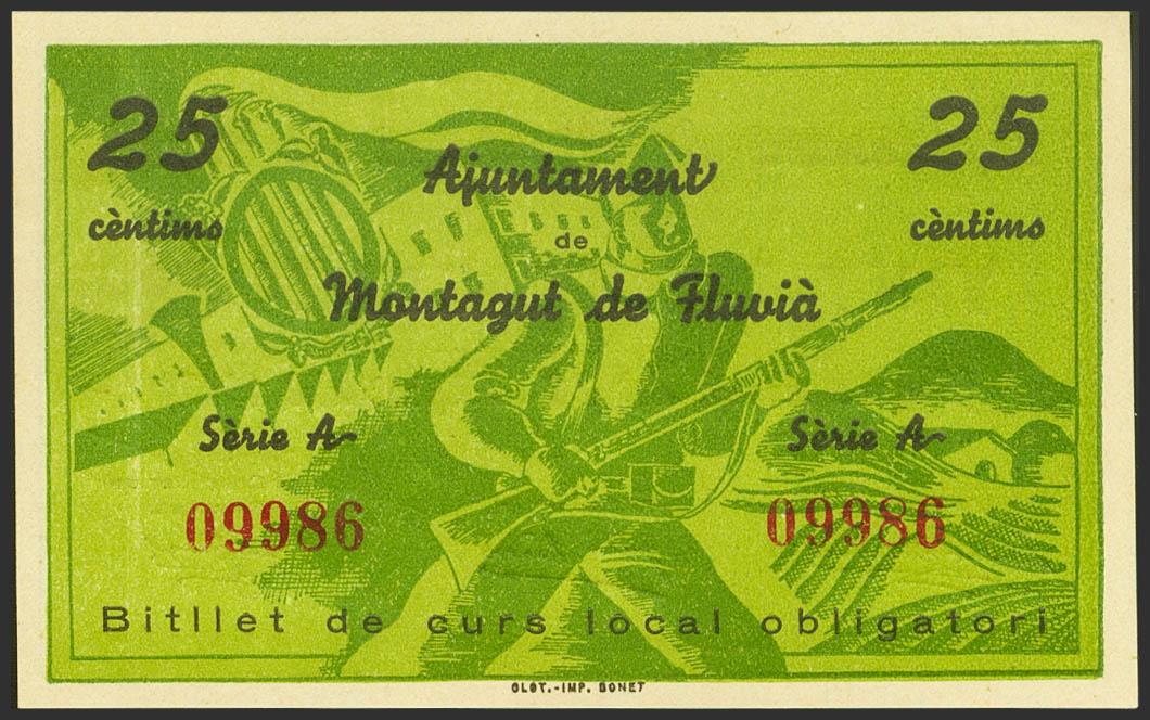 English MONTAGUT DE FLUVIA (GERONA). 25 Cents. August 26, 1937. Series A. (González: 8738). Unusual, especially in this exceptional quality. Uncirculated.