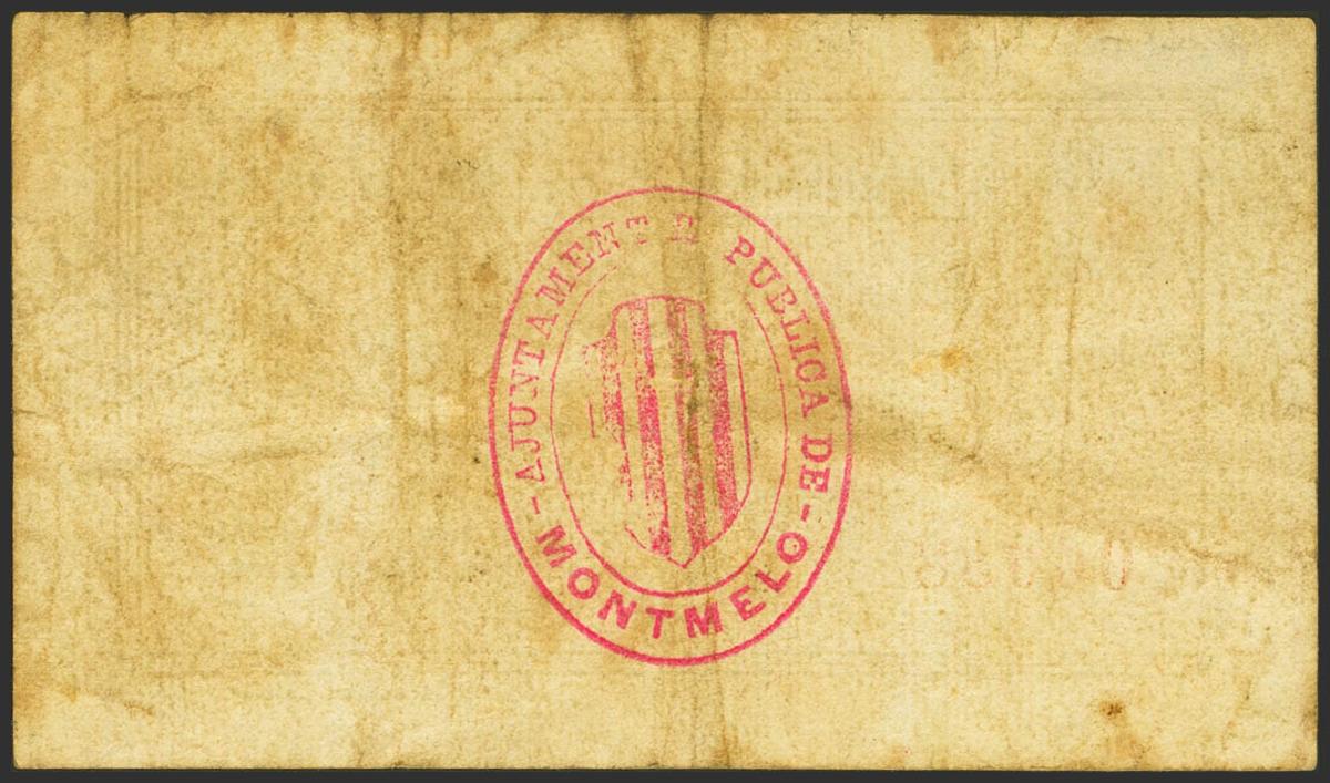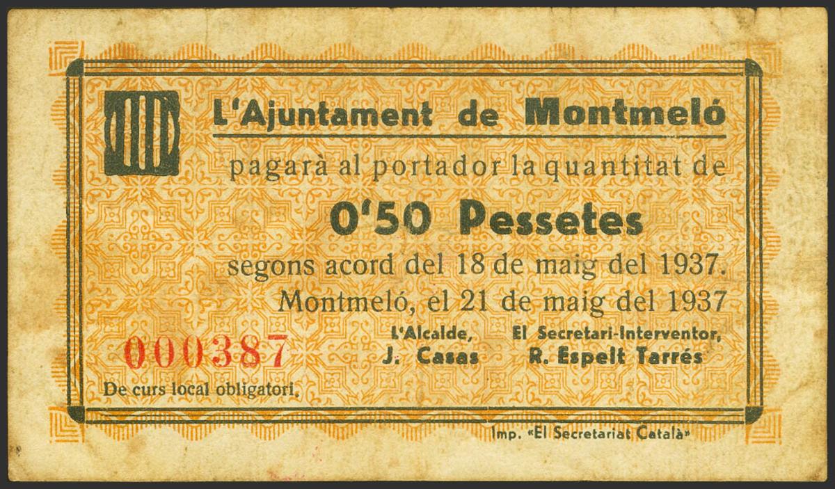 MONTMELO (BARCELONA). 50 Cents. May 18, 1937. (González: 8803). Rare. Good Very Fine
