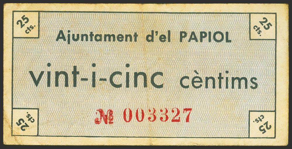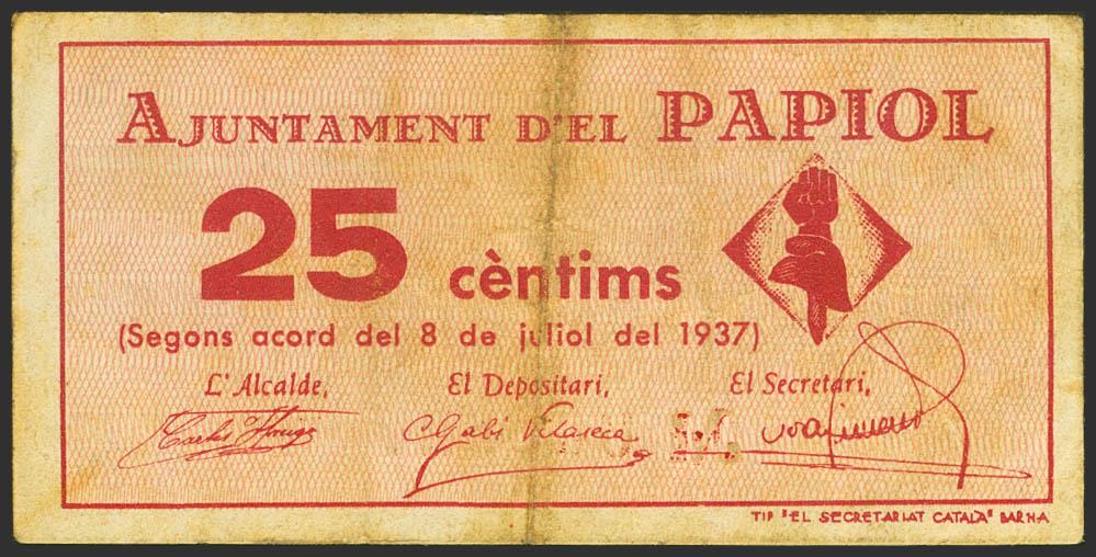 PAPIOL (BARCELONA). 25 Cents. July 8, 1937. (González: 9152). Almost Very Fine.