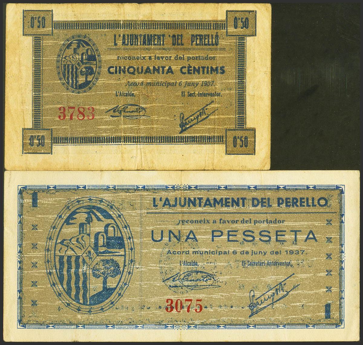 English PERELLO (TARRAGONA). 50 Cents and 1 Peseta. August 6, 1937. (González: 9203/04). Rare complete series. Good Very Fine.