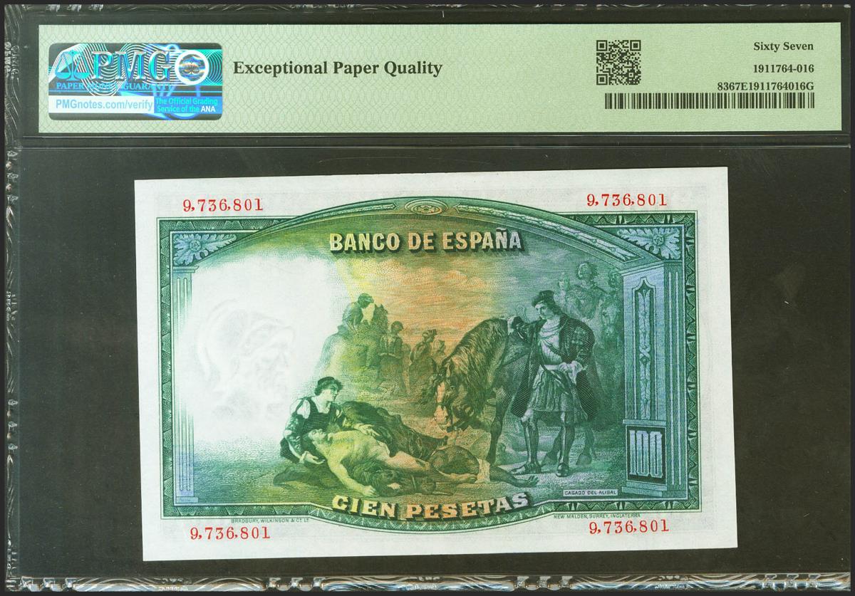 100 Pesetas. April 25, 1931. No series. (Edifil 2021: 360, Pick: 83). Rare in this exceptional quality, original sizing. Uncirculated. PMG67EPQ package.