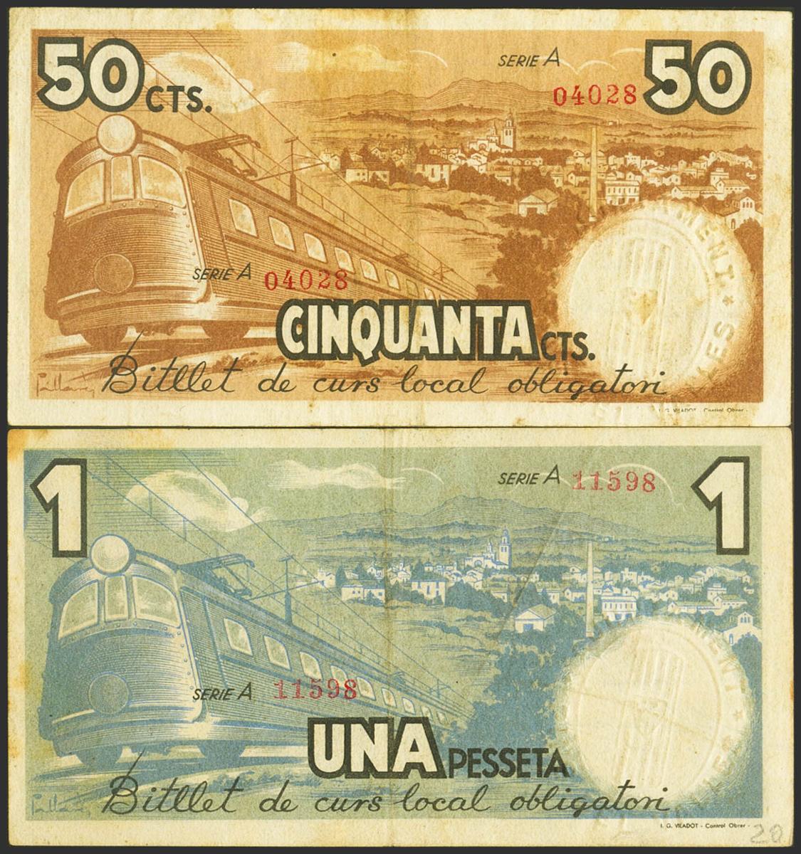 PINS DEL VALLES (BARCELONA). 50 Cents and 1 Peseta. May 12, 1937. Series A, both. (González: 9244/45). Rare complete series. Good Very Fine.