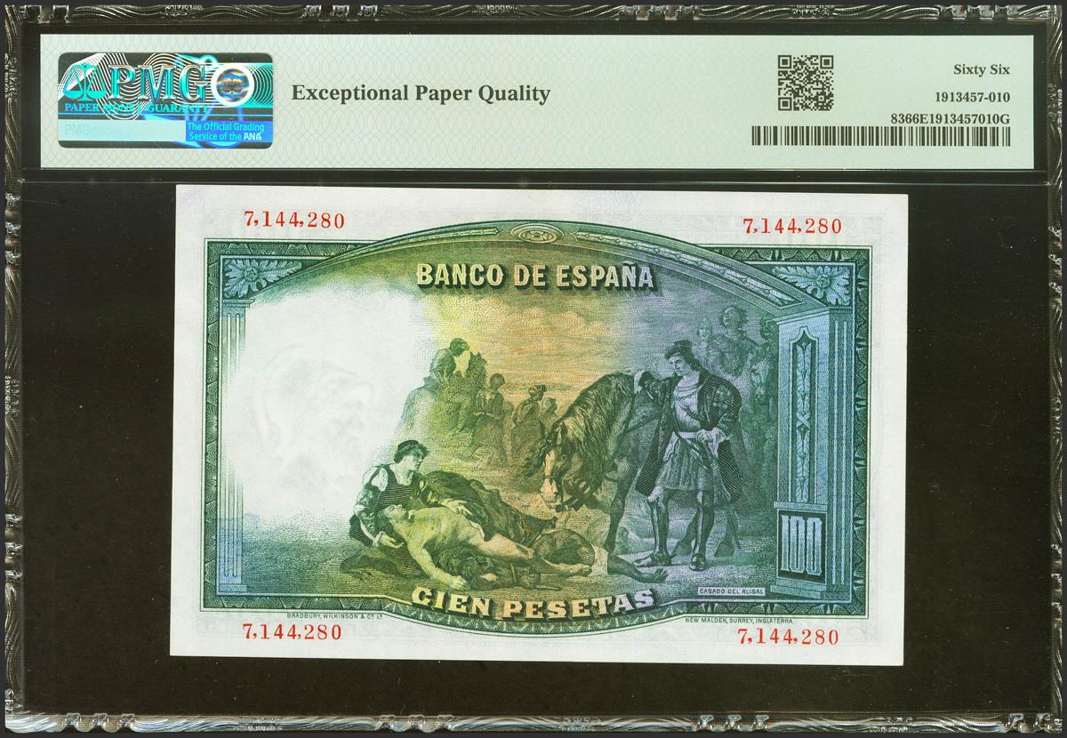 English 100 Pesetas. April 25, 1931. No series. (Edifil 2021: 360, Pick: 83). Unusual in this quality, original sizing. Uncirculated. PMG66EPQ package.