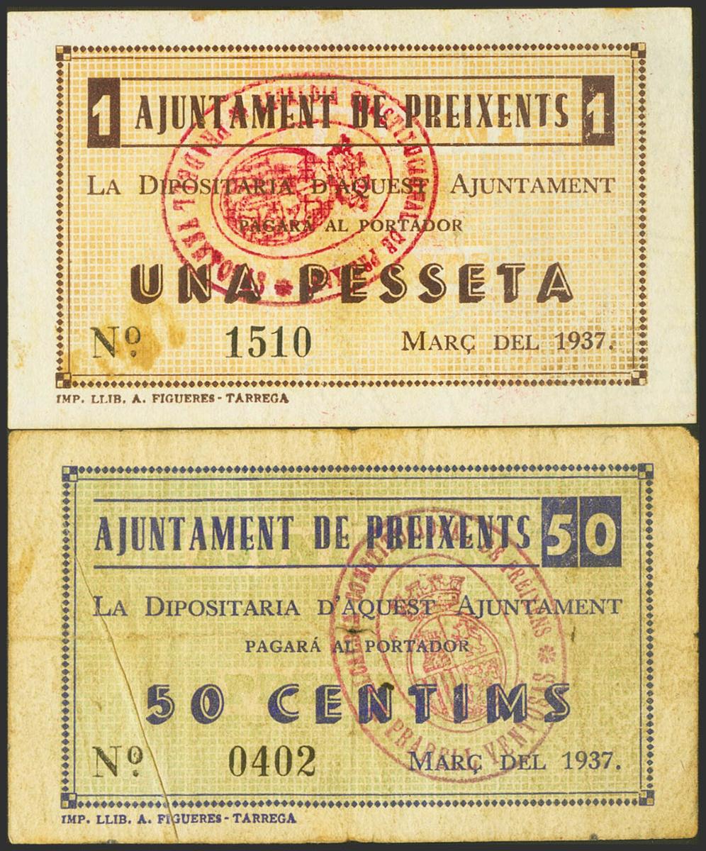 English PREIXENTS (LERIDA). 50 Cents and 1 Peseta. March 1937. (González: 9447/48). Very rare complete series. Almost Very Fine/ Good Extremely Fine.