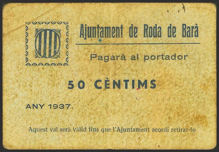 English RODA DE BARA (TARRAGONA). 50 Cents. (1937ca). (González: 9715). Rare. Good Very Fine.