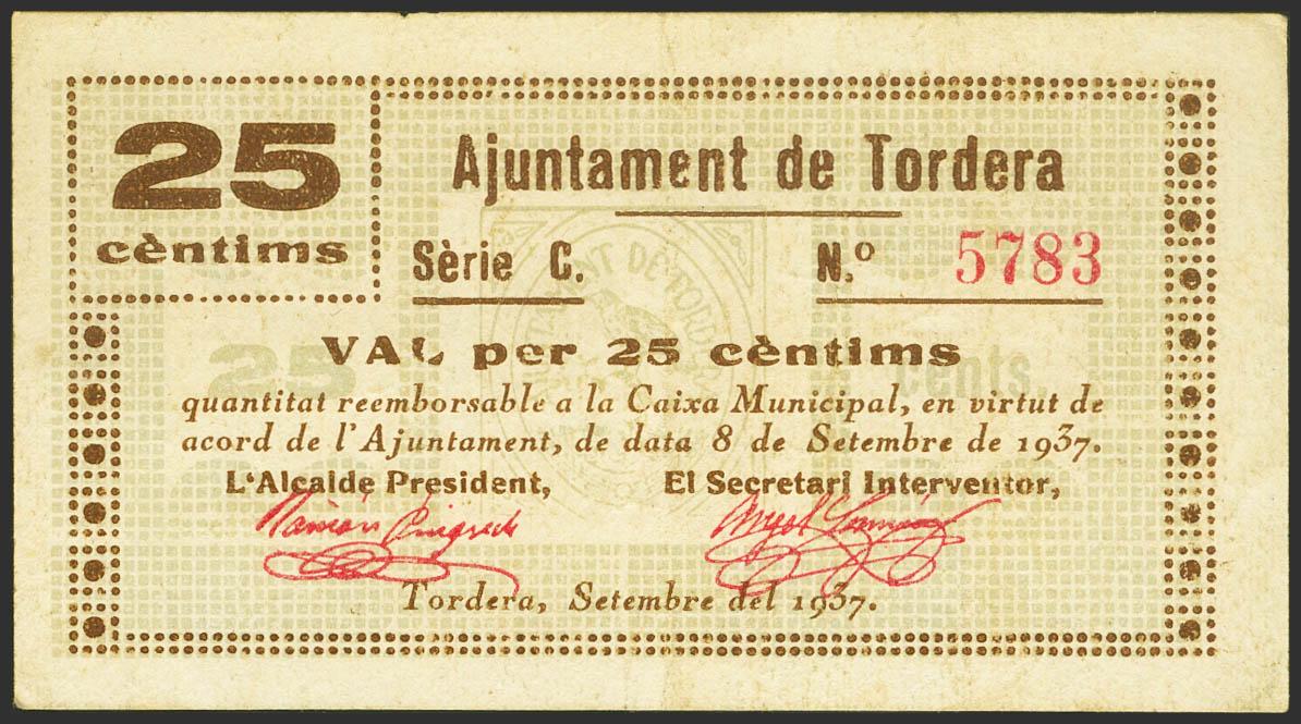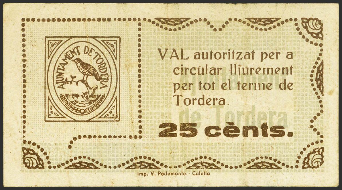 TORDERA (BARCELONA). 25 Cents. September 8, 1937. (González: 10306). Unusual. Good Very Fine.