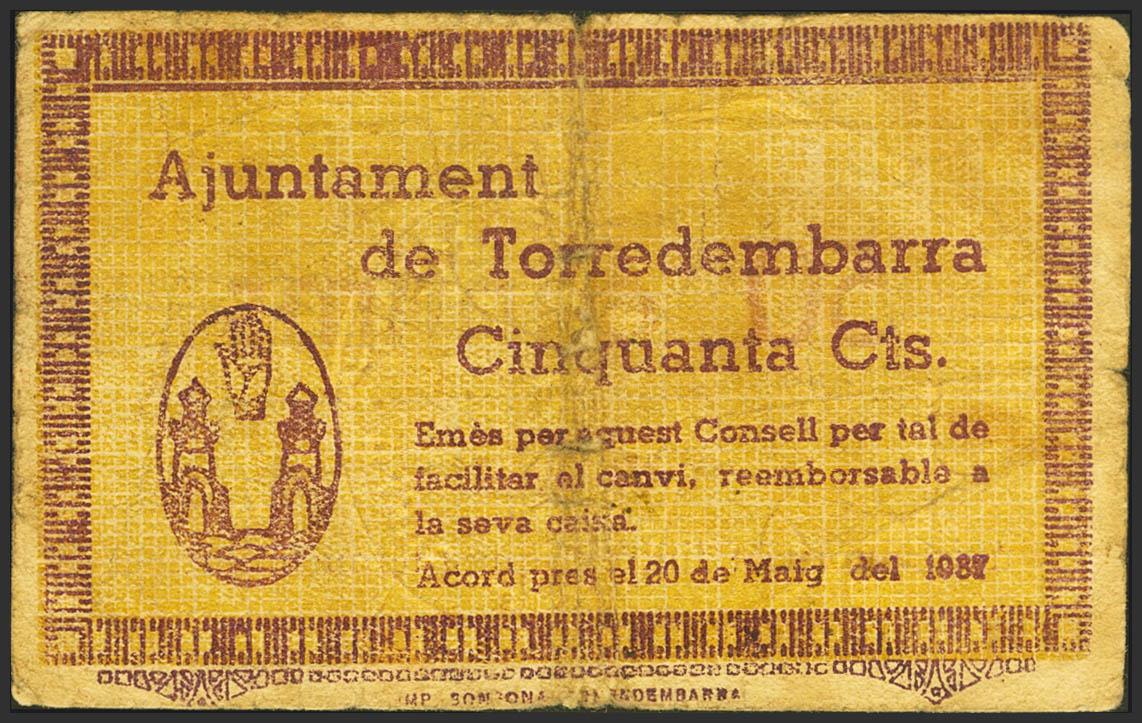 English TORREDEMBARRA (TARRAGONA). 50 Cents. May 20, 1937. (González: 10352). Unusual. Almost Very Fine.
