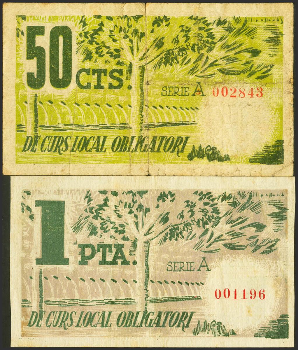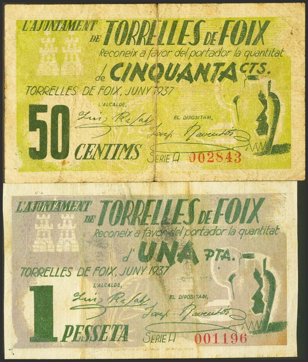 TORRELLES DE FOIX (BARCELONA). 50 Cents and 1 Peseta. June 1937. Series A, both. (González: 10372/73). Rare complete series. Very Fine.